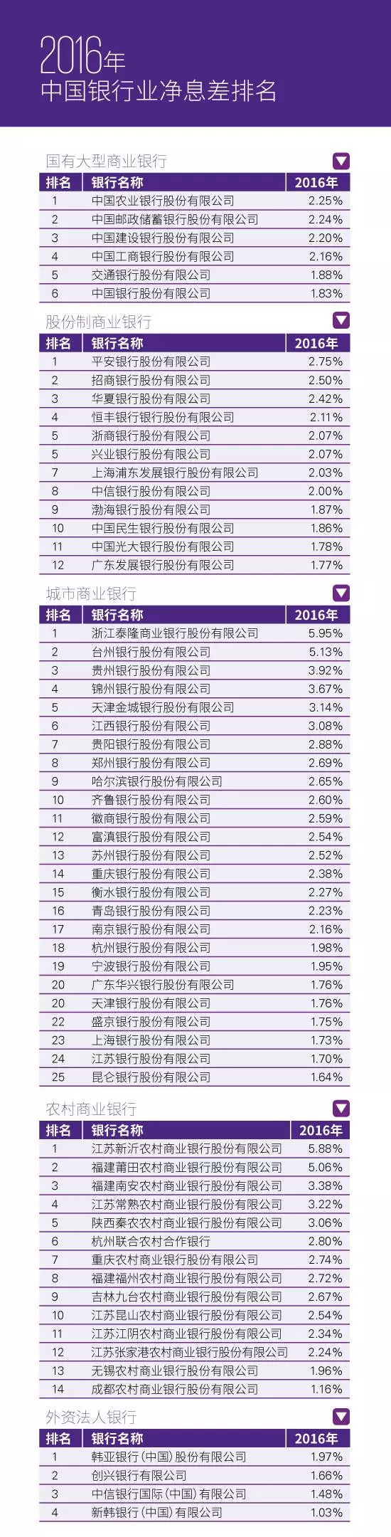 畢馬威于2017年7月27日發(fā)布了《2017年中國(guó)銀行業(yè)調(diào)查報(bào)告》,本文按國(guó)有大型商業(yè)銀行、股份制商業(yè)銀行、城市商業(yè)銀行、農(nóng)村商業(yè)銀行和外資法人銀行分類(lèi),對(duì)《2017年中國(guó)銀行業(yè)調(diào)查報(bào)告》中展示的200家銀行2016年的凈利潤(rùn)增長(zhǎng)率和凈息差兩大盈利能力指標(biāo)進(jìn)行了排名。